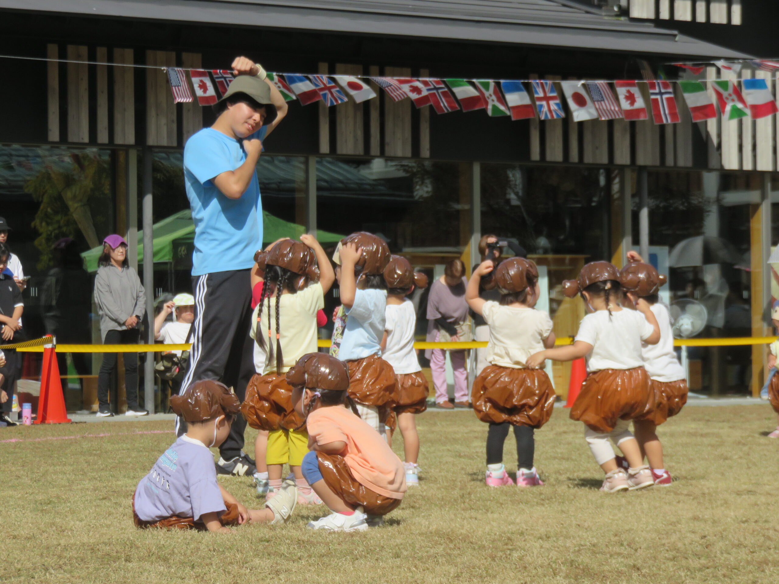 1歳児りす組と2歳児うさぎ組の踊り。おさるさんの曲に合わせて踊ったので、子ども達はお猿に変身♪先生と一緒に踊ったり、友達の様子や周りが気になったりしながらも、笑顔で踊った子ども達でした。