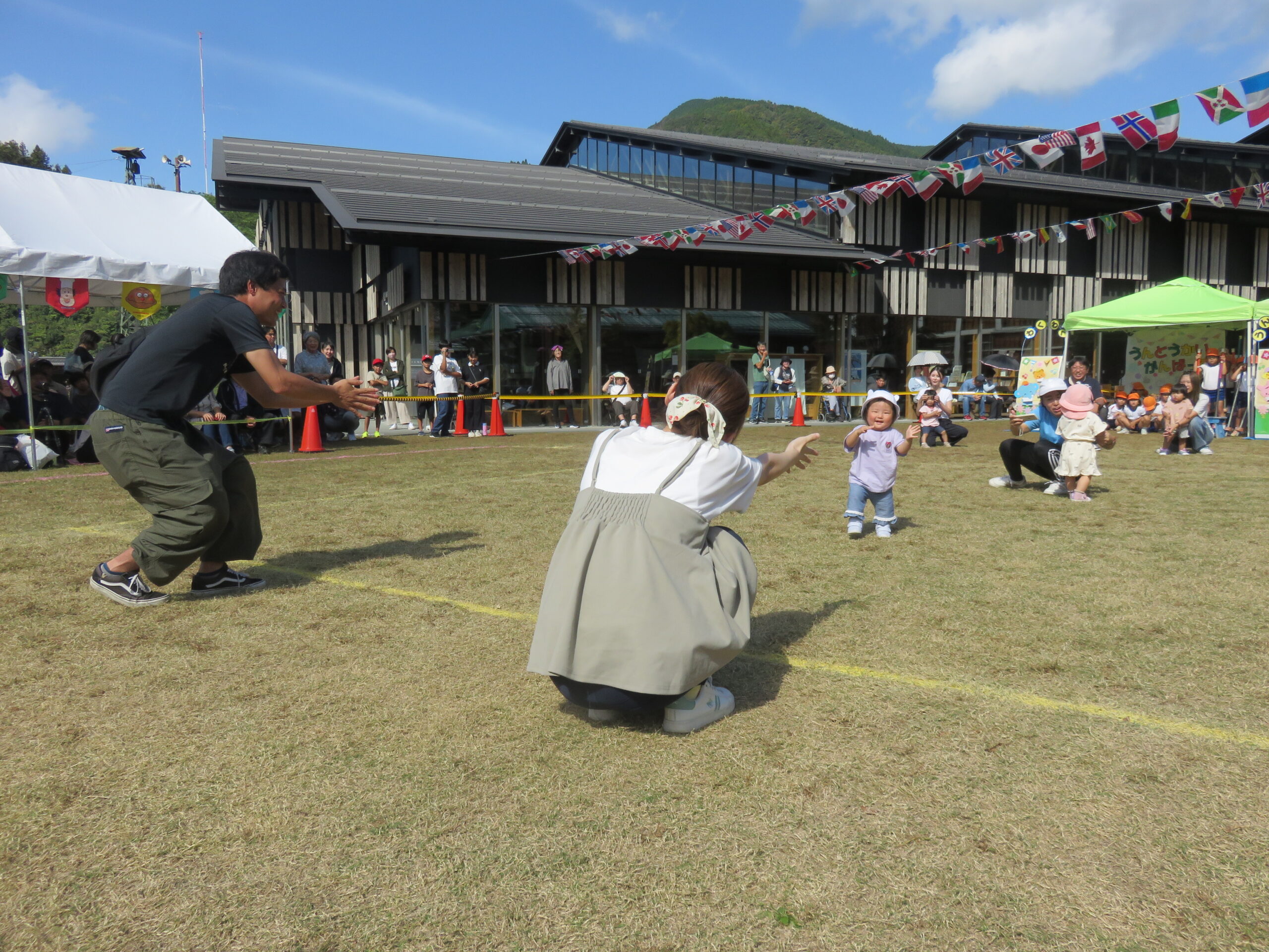 0歳児ひよこ組親子競技の様子。よちよち歩きでお家の人のところまで行きましたよ❤️