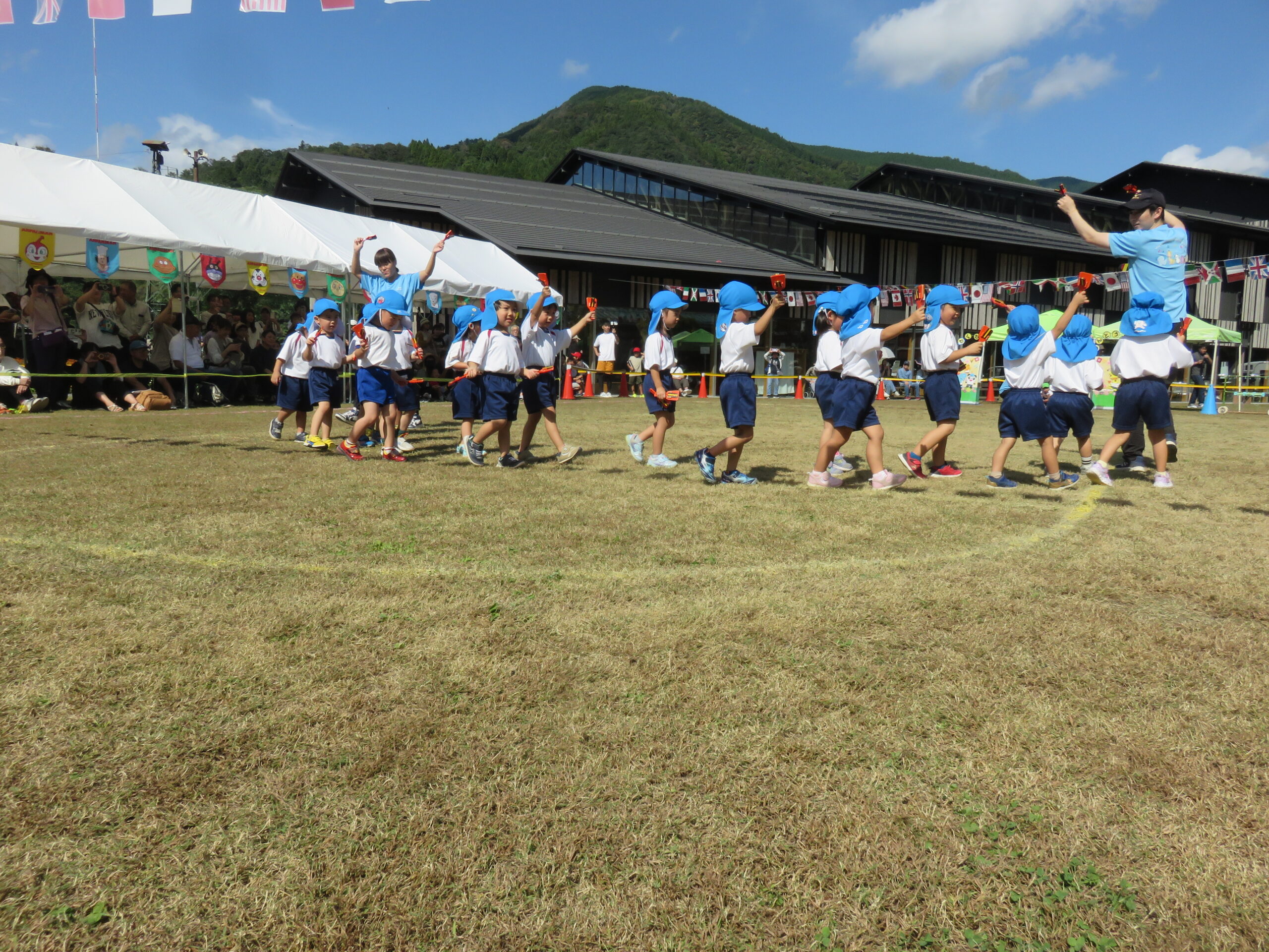 3歳児ぱんだ組よさこい鳴子踊り。4、5歳児が梼原町の高原祭りでよさこい鳴子踊りを踊るので、その踊りを見て、ぱんだ組もよさこい鳴子踊りに憧れ、運動会で披露しました。