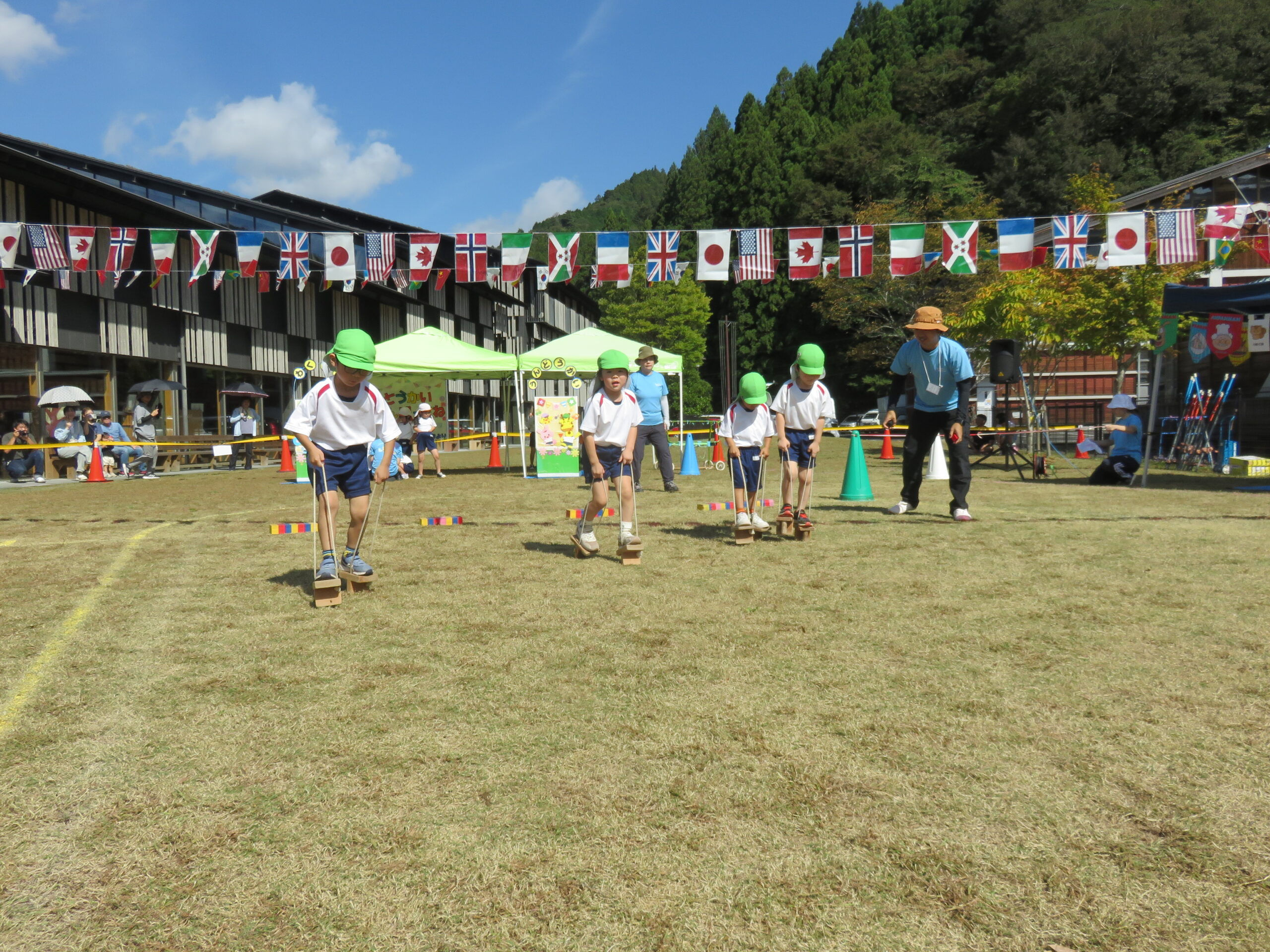 4歳児きりん組。競技で、一本下駄に挑戦!紐をピンと引っ張って持てるようになったら、どんどん進める距離も長くなり、運動会で見てもらいました。