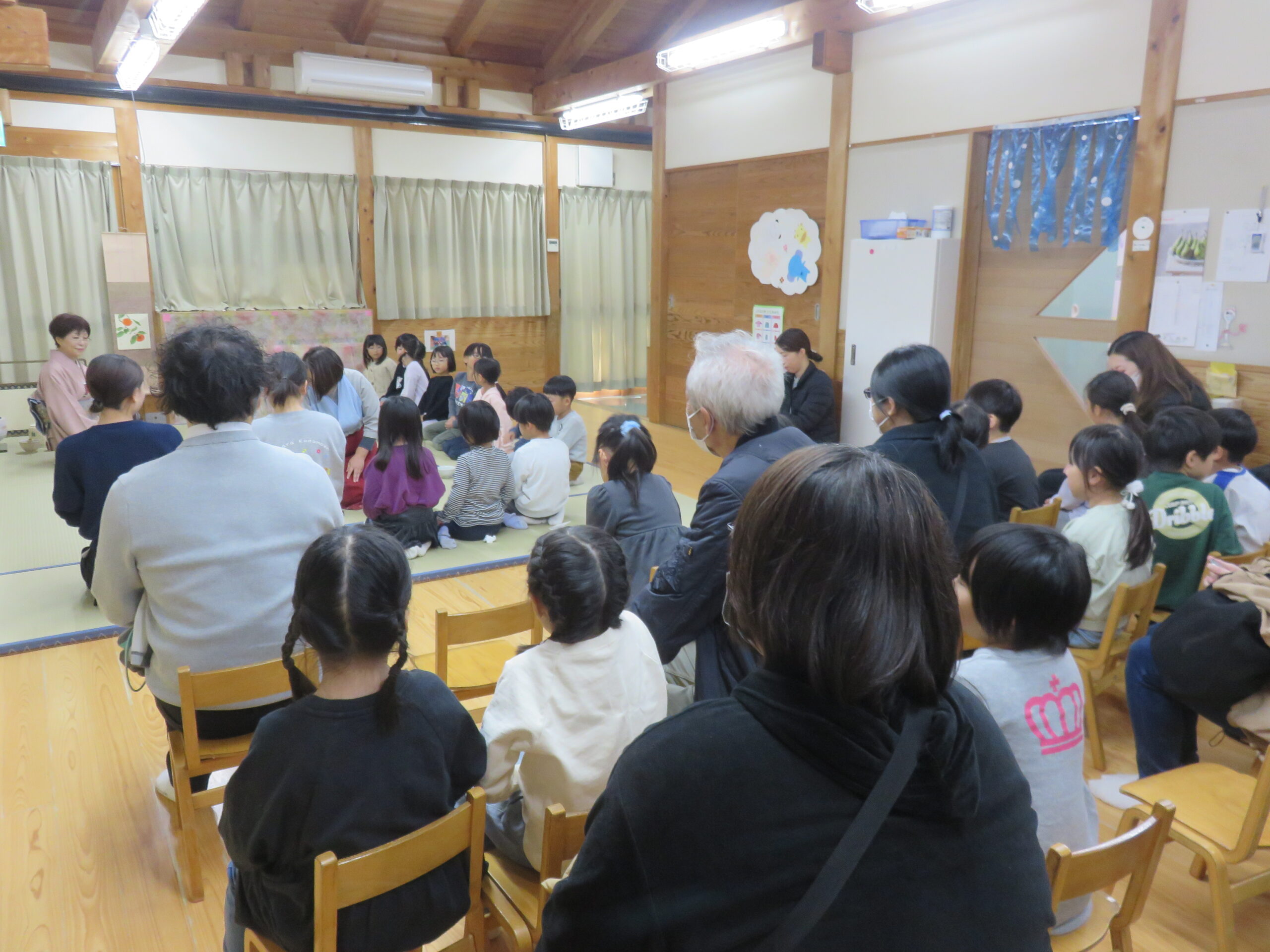 3、4、5歳児の参観日があり、お家の方にお茶席の様子を見てもらったり、それぞれの部屋でお家の人と一緒に遊んだりしました。