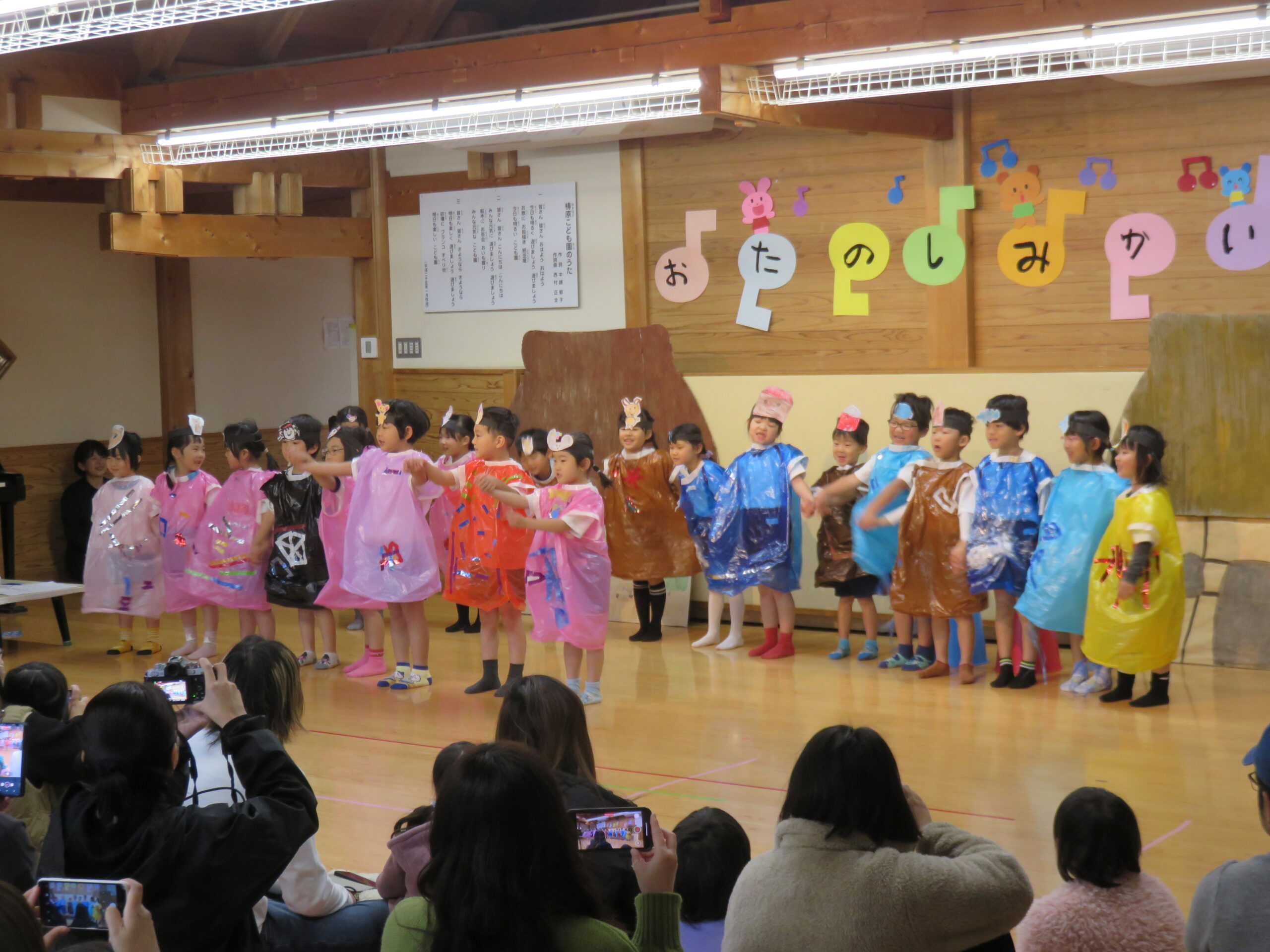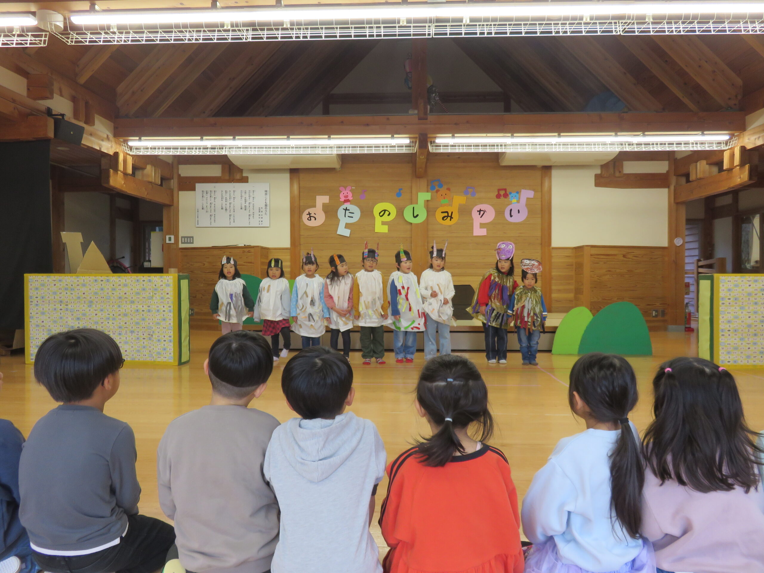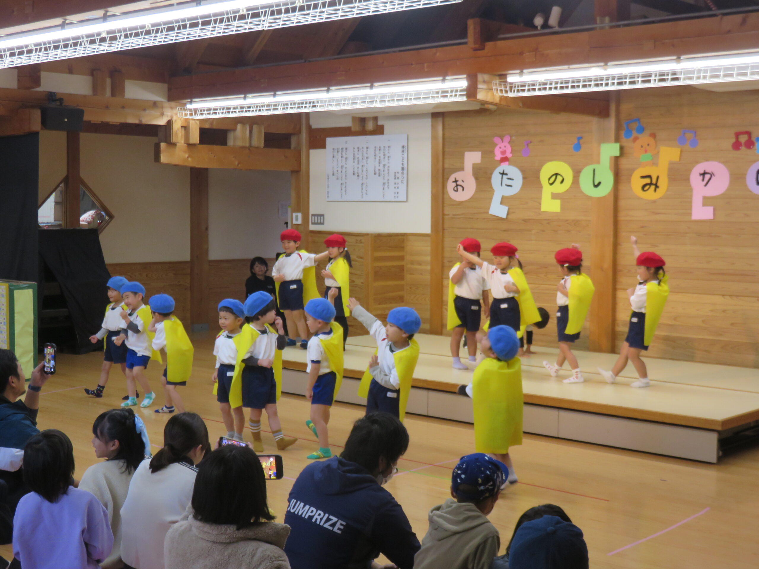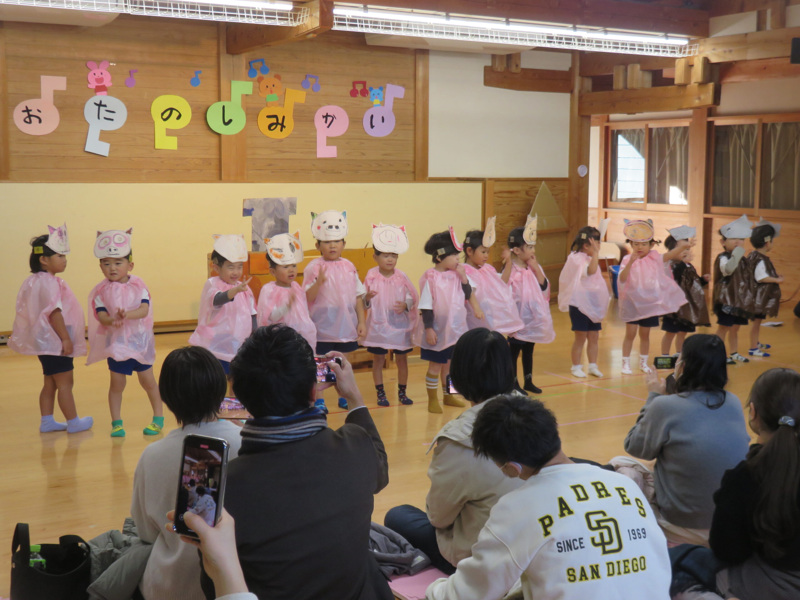 ぱんだ組の子どもたちは、初めてのお楽しみ会参加でした。大勢の人の前で少し戸惑っている子どもさんもいましたが、お家の人を見つけると手を振ったり、大きな声でセリフを言ったりする姿も見られました。