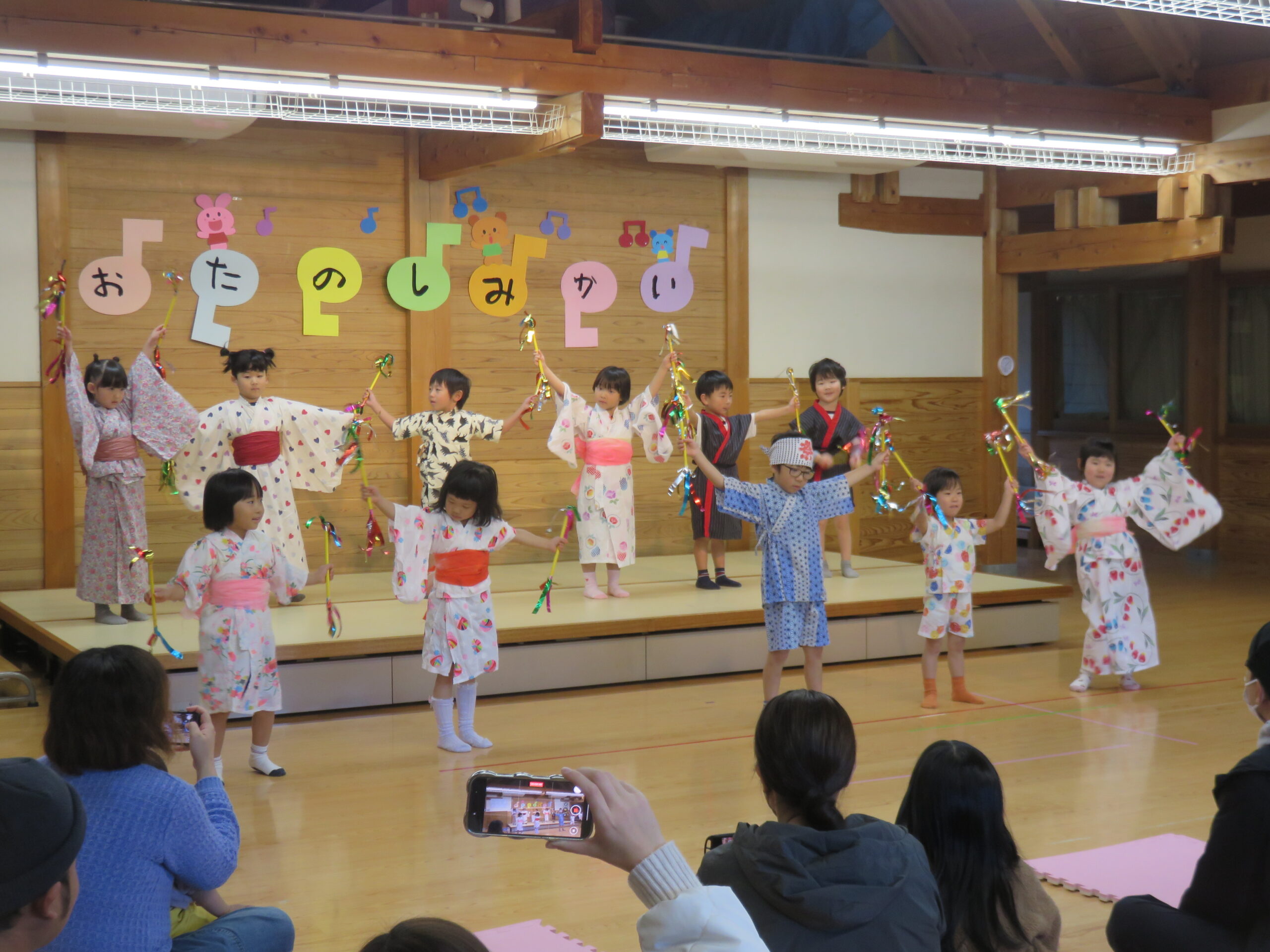 12月初めに、3、4、5歳児幼児組で、日頃親しんでいるお話や踊りなどをお家の方に披露するお楽しみ会がありました。