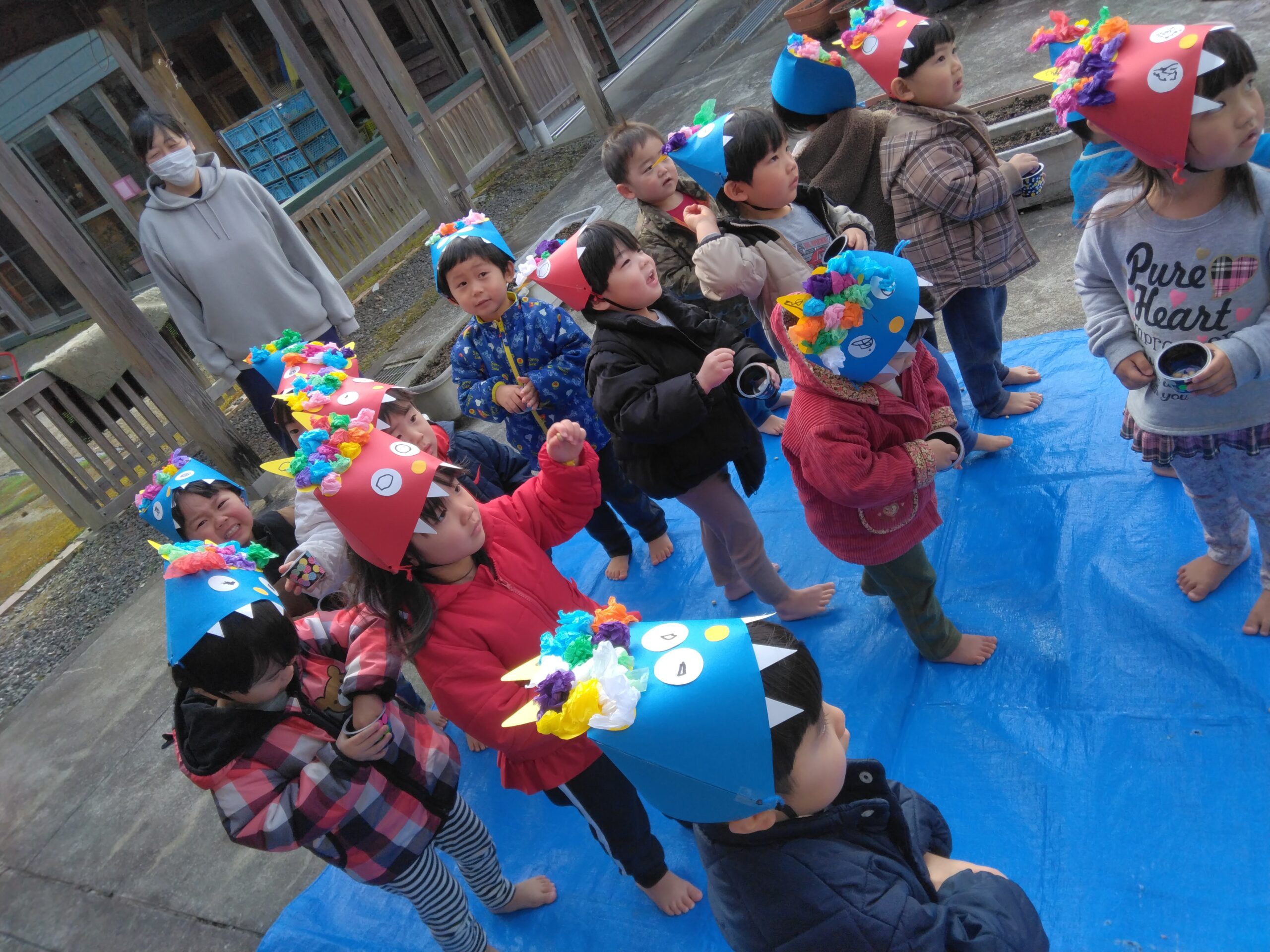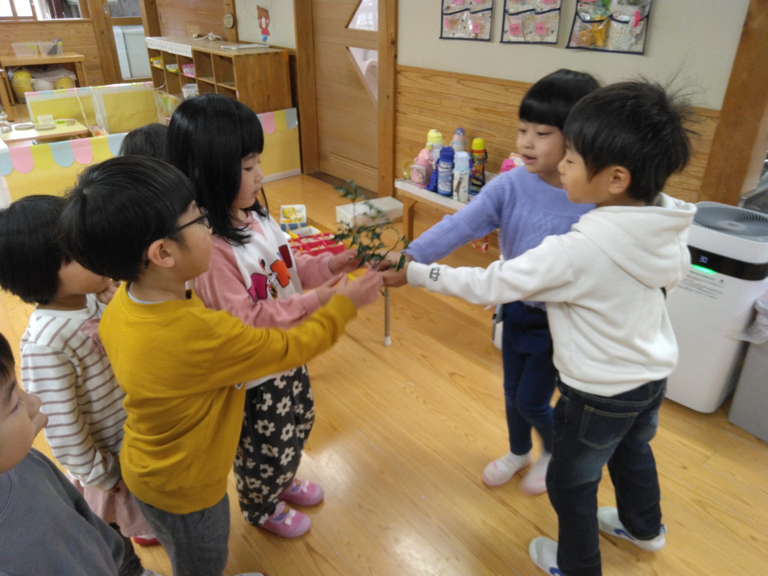幼児組の方は、園庭に出て豆まきをしました。みんなが投げる豆を嫌がって鬼さんは逃げていきました。その後、福の神様がやってきてくれ、梅の花の贈り物をしてくださいました。